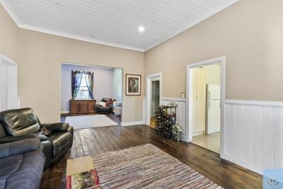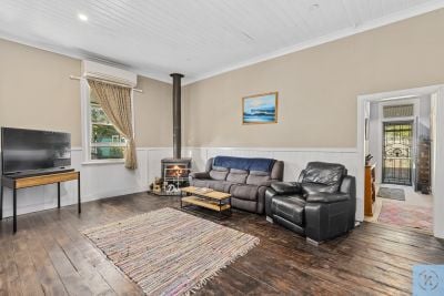 Beautiful Living Space: The open-plan lounge and dining area showcases stunning original floorboards, a large combustion fireplace, split-system air conditioning, and modern downlights-creating a warm and welcoming atmosphere.
