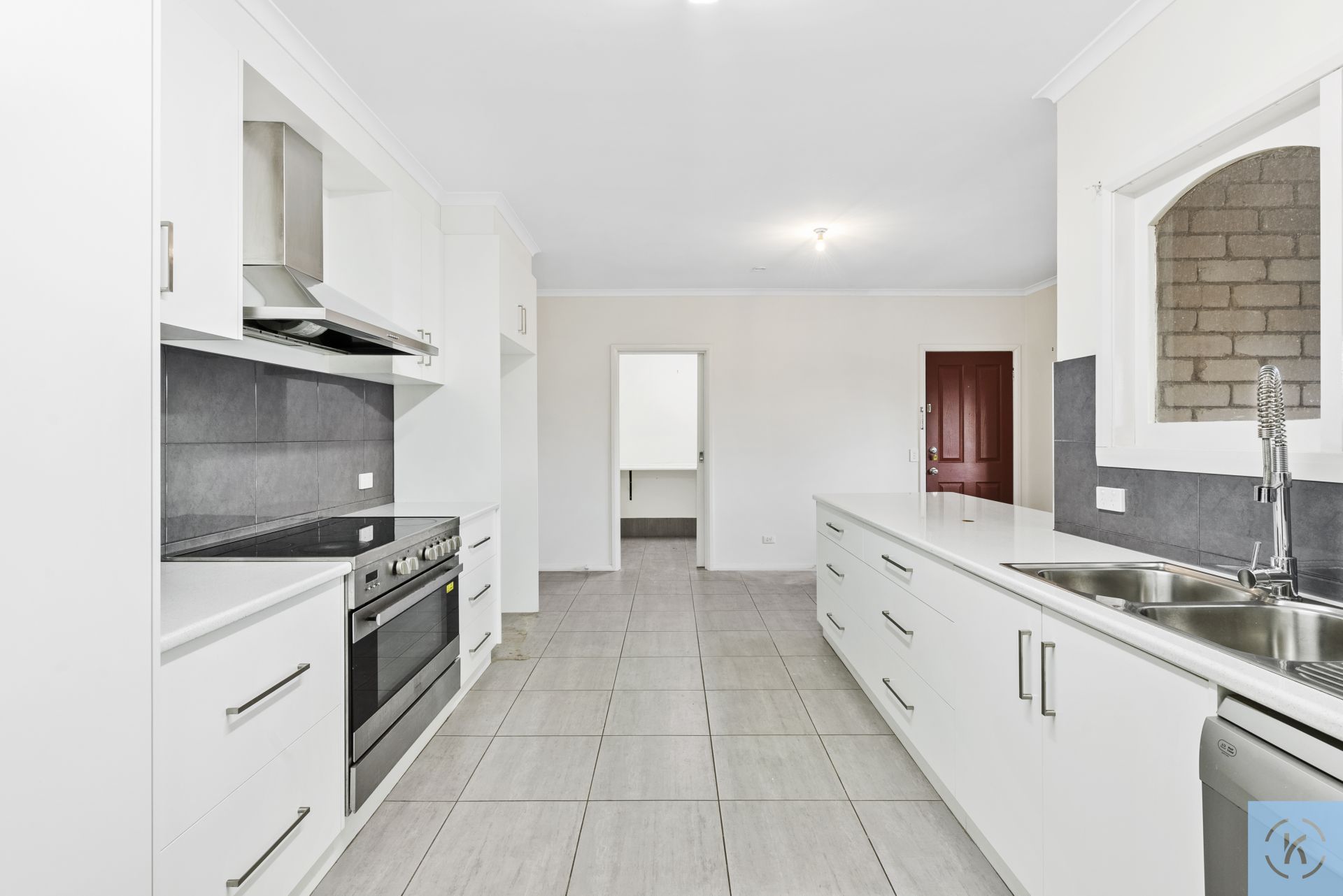 The kitchen is equipped with an electric wall oven, hotplates, dishwasher, and pantry, ensuring practical and efficient meal preparation. Reverse-cycle air conditioning provides year-round comfort throughout the home.